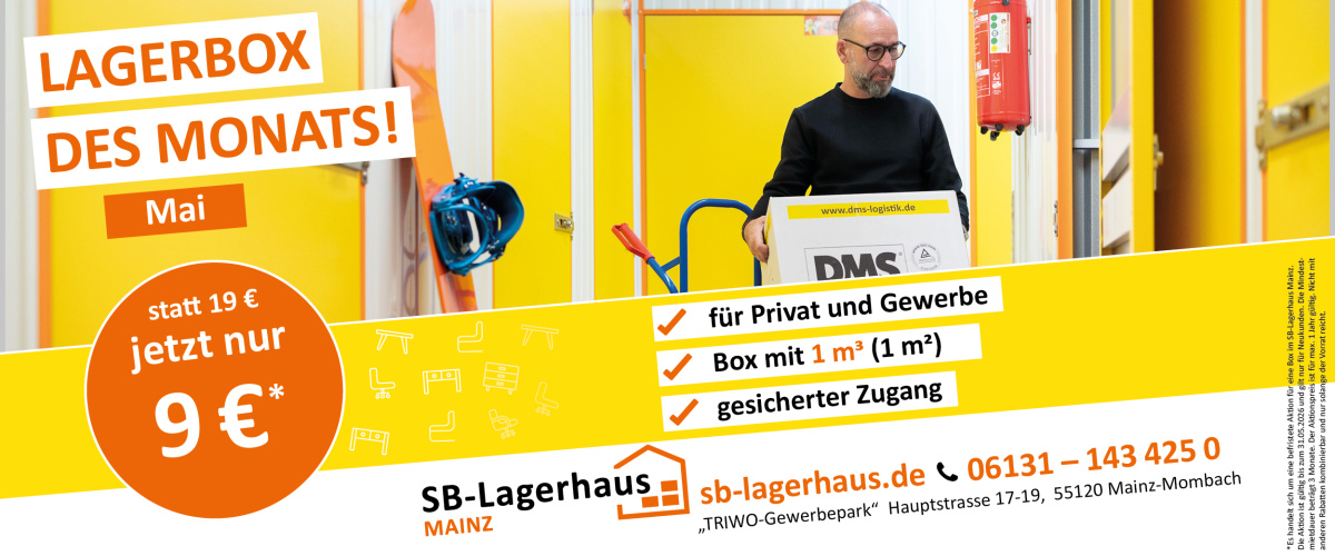 Da es oftmals mit dem Umziehen allein nicht getan ist, halten wir für Sie noch viele weitere nützliche Angebote bereit. Für Umzüge mit "Zwischenstopp" bietet unser SB-Lagerhaus privaten und gewerblichen Kunden günstige, saubere und sichere Lagerboxen direkt in Mainz. Und das sogar klimaneutral.
